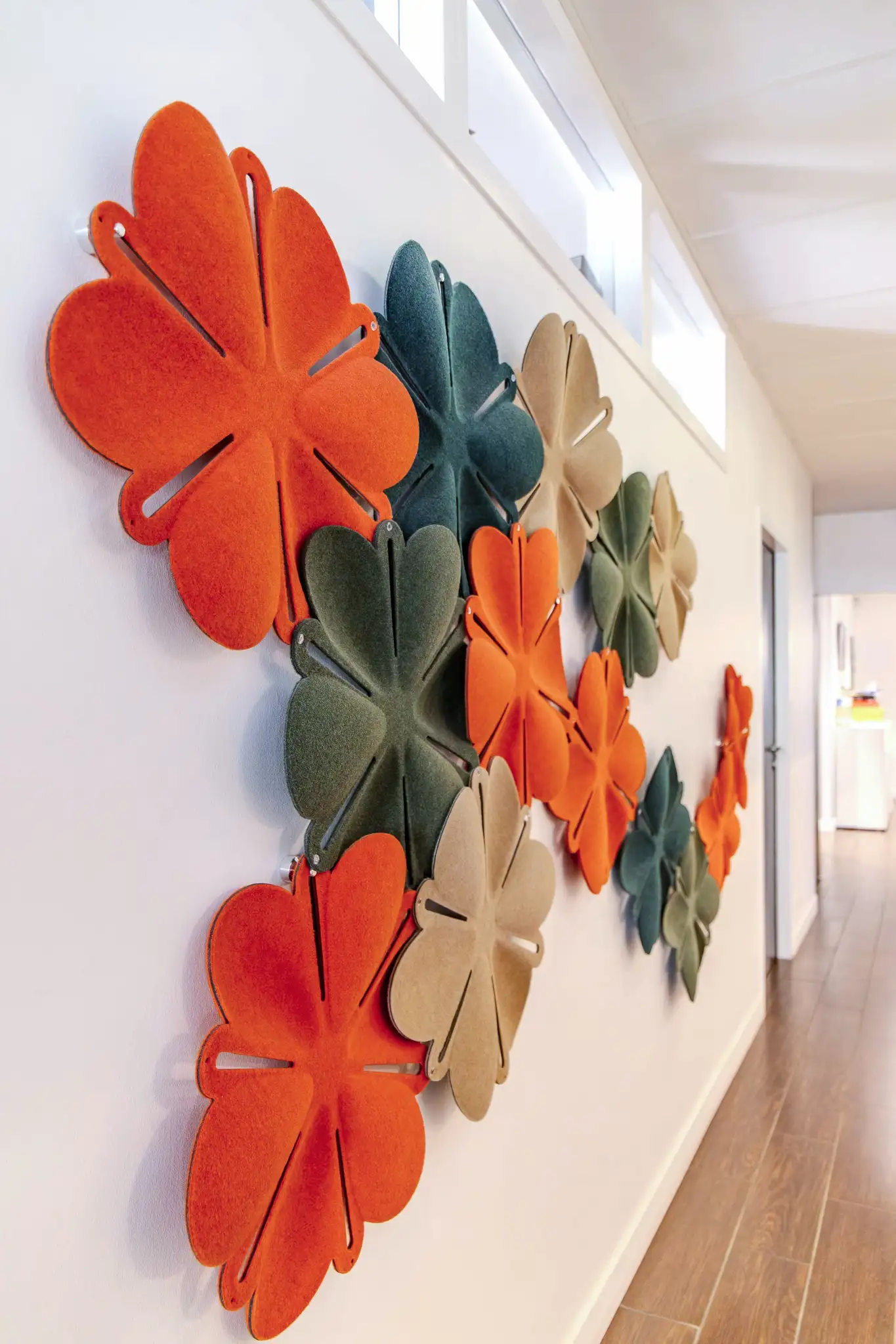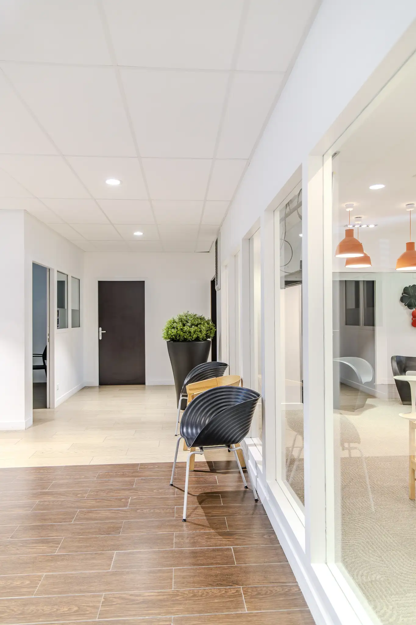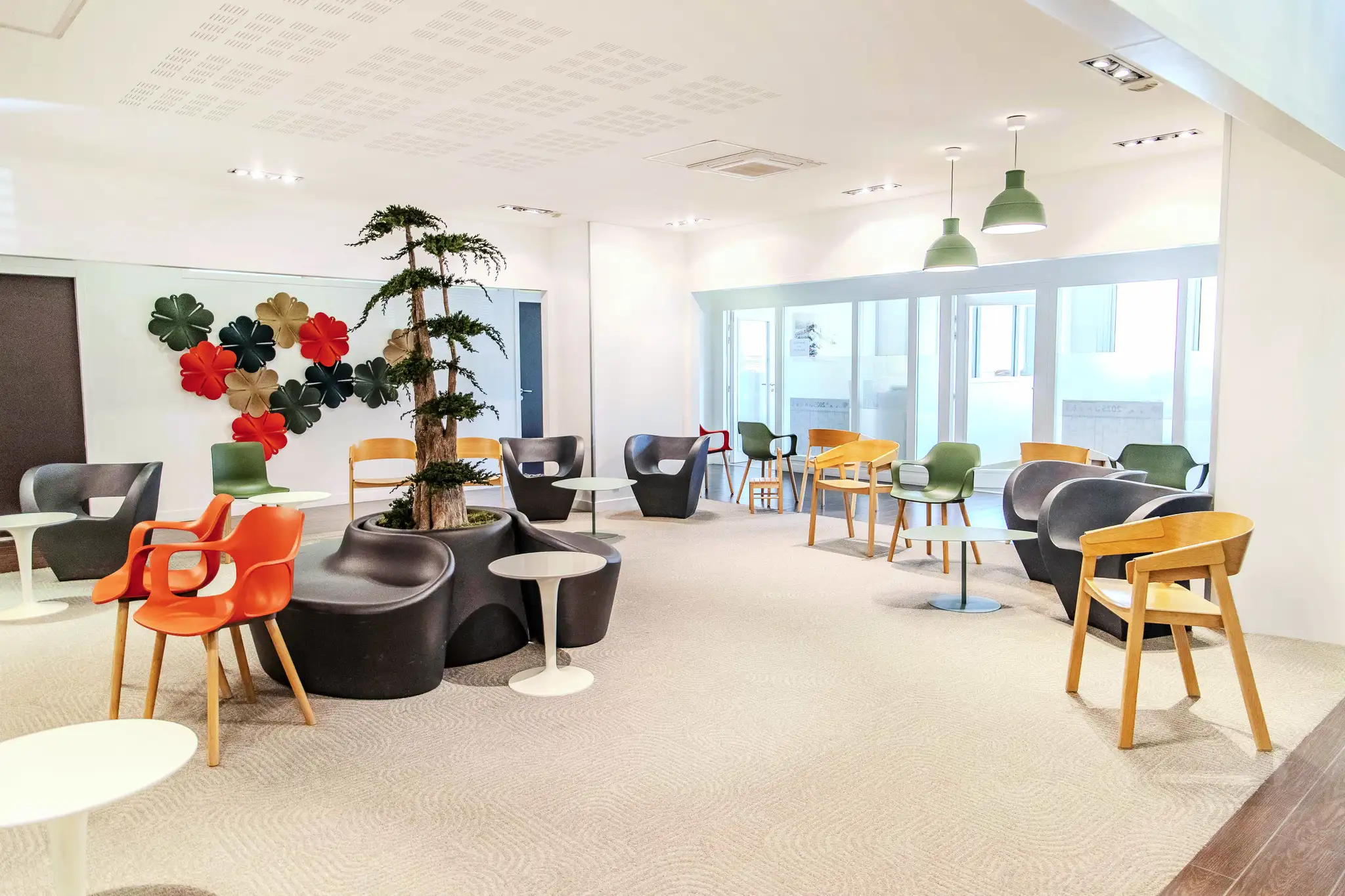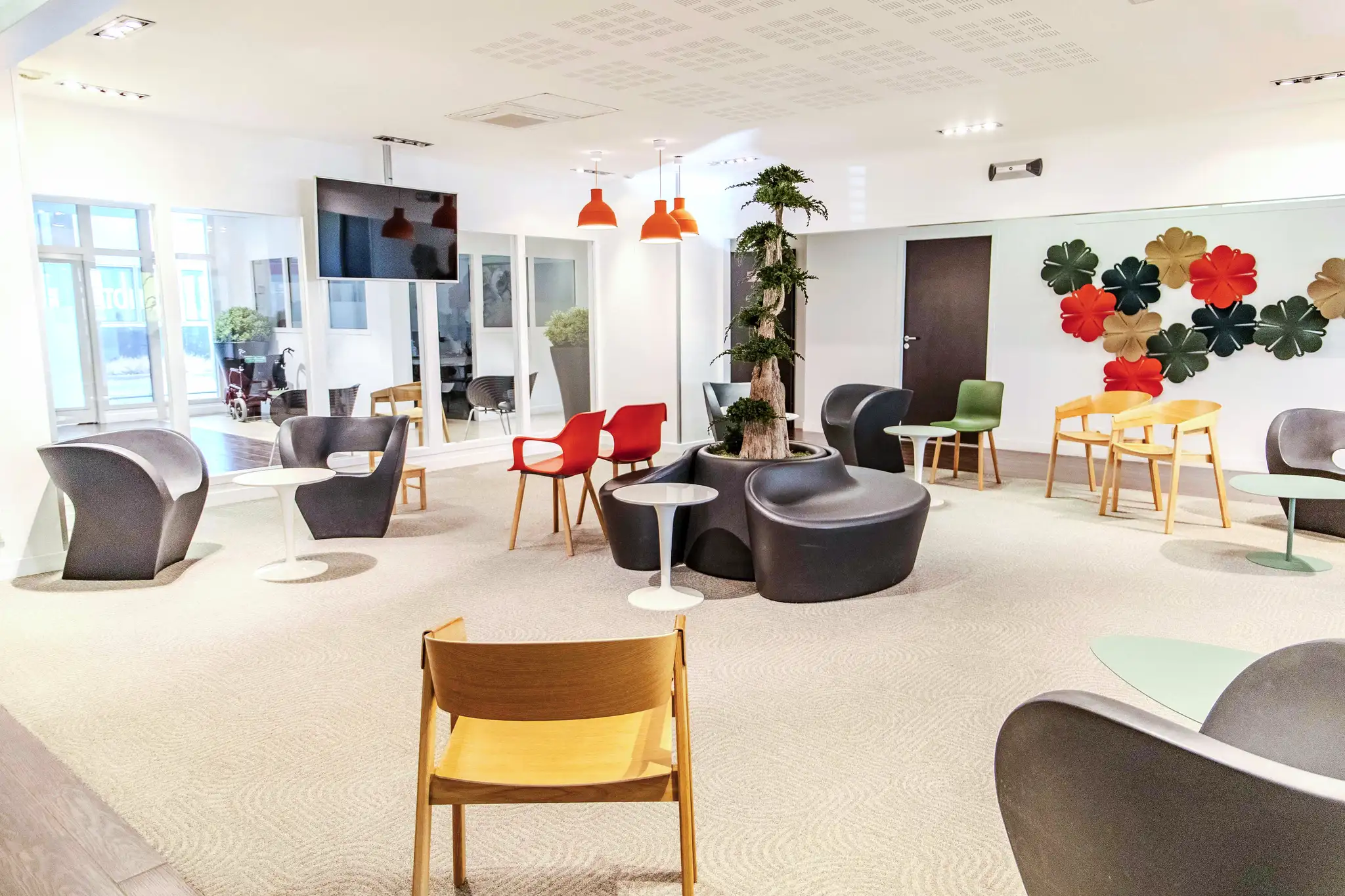 La nouvelle implantation, s’appuie sur une composition de mobiliers design et ergonomique, une organisation circulaire autour d’un îlot végétal, un travail colorimétrique doux, inspiré de la nature, des fleurs acoustiques murales permettant de réduire le bruit d’ambiance.