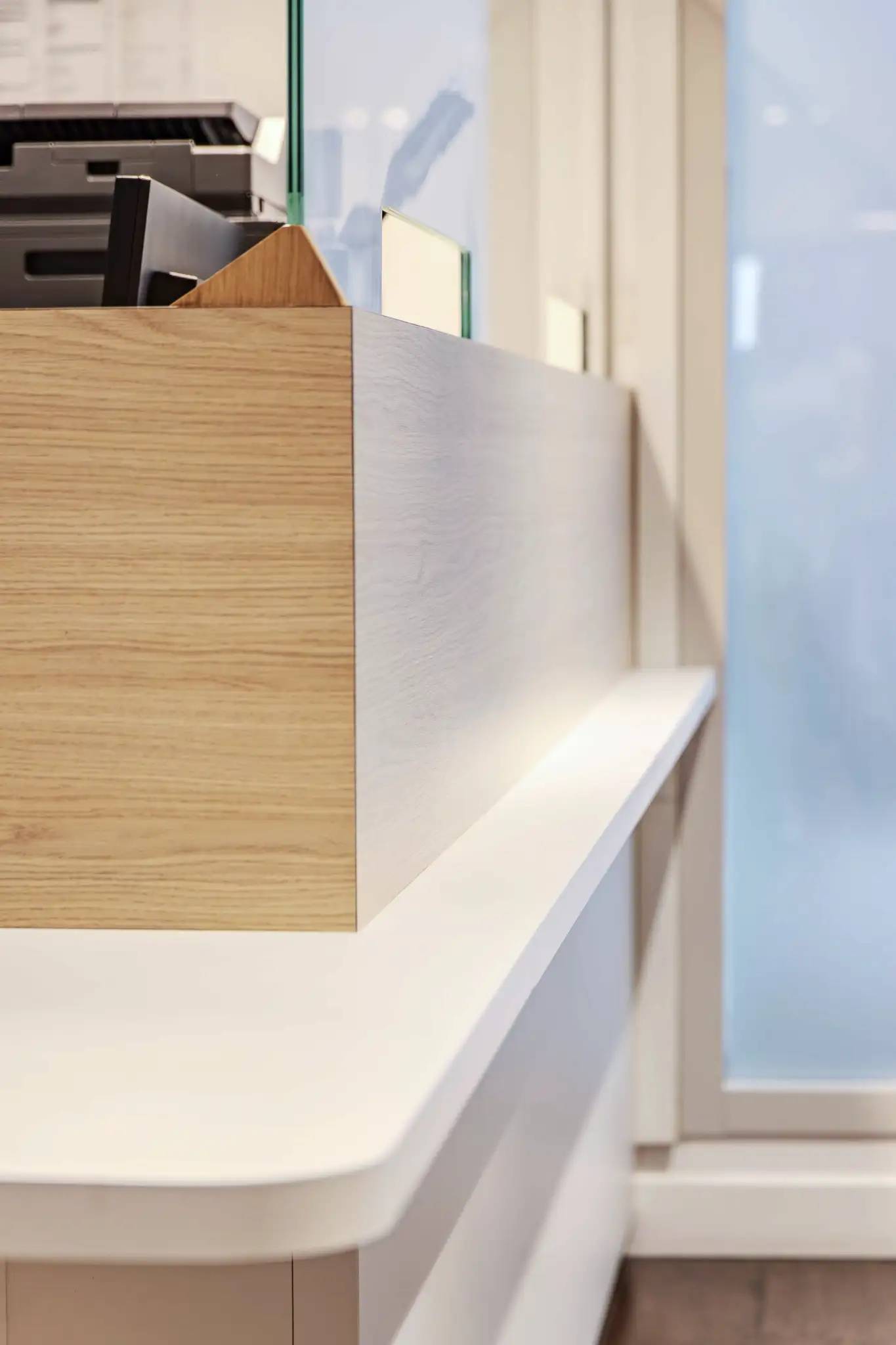 Le nouveau comptoir d’accueil reprend les codes du mobilier médical contemporain : lignes épurées, zones de travail équipées, protections vitrées et circulations maîtrisées.