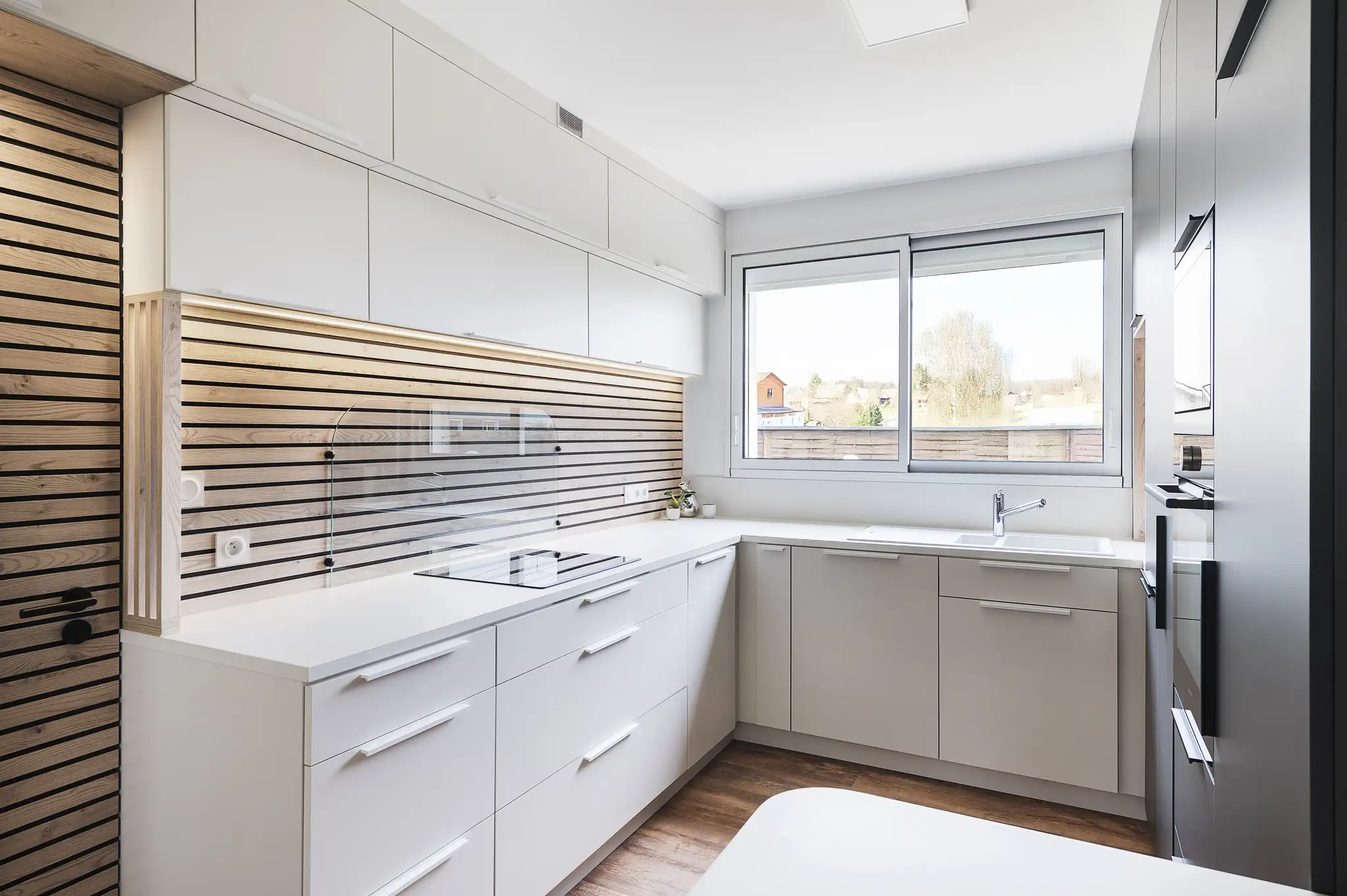 La crédence en bois rainuré crée une identité forte, contemporaine, chaleureuse. Les détails de finition pieds chromés de l’îlot, bande LED sous meubles hauts, intégration parfaite des appareils signent une cuisine sur mesure, pensée pour durer.