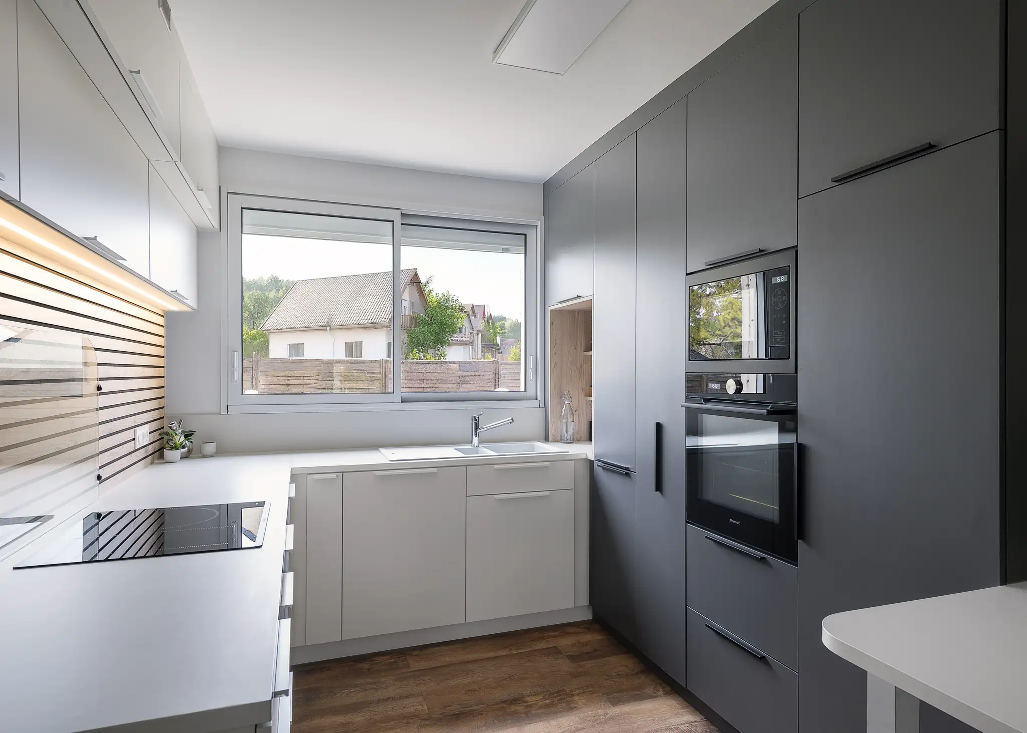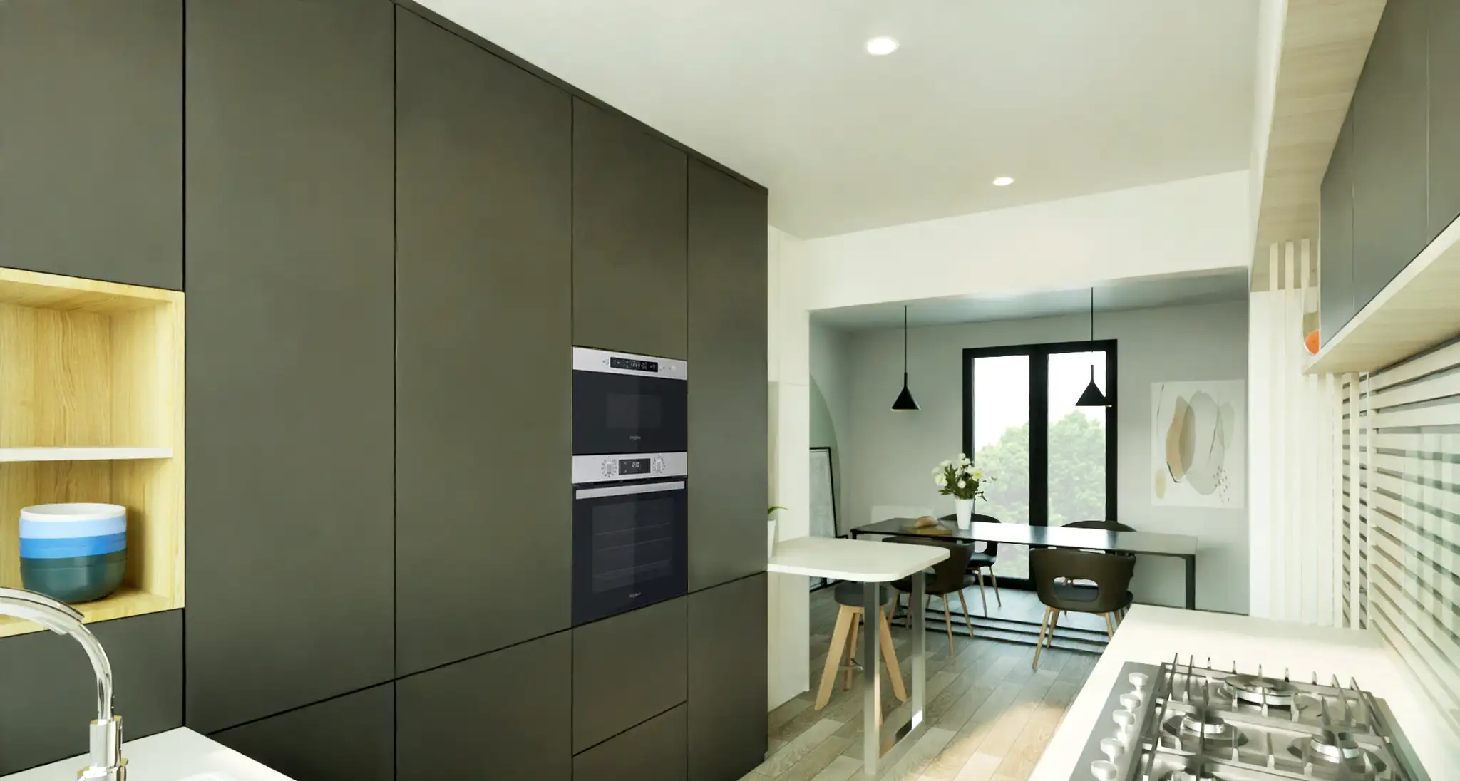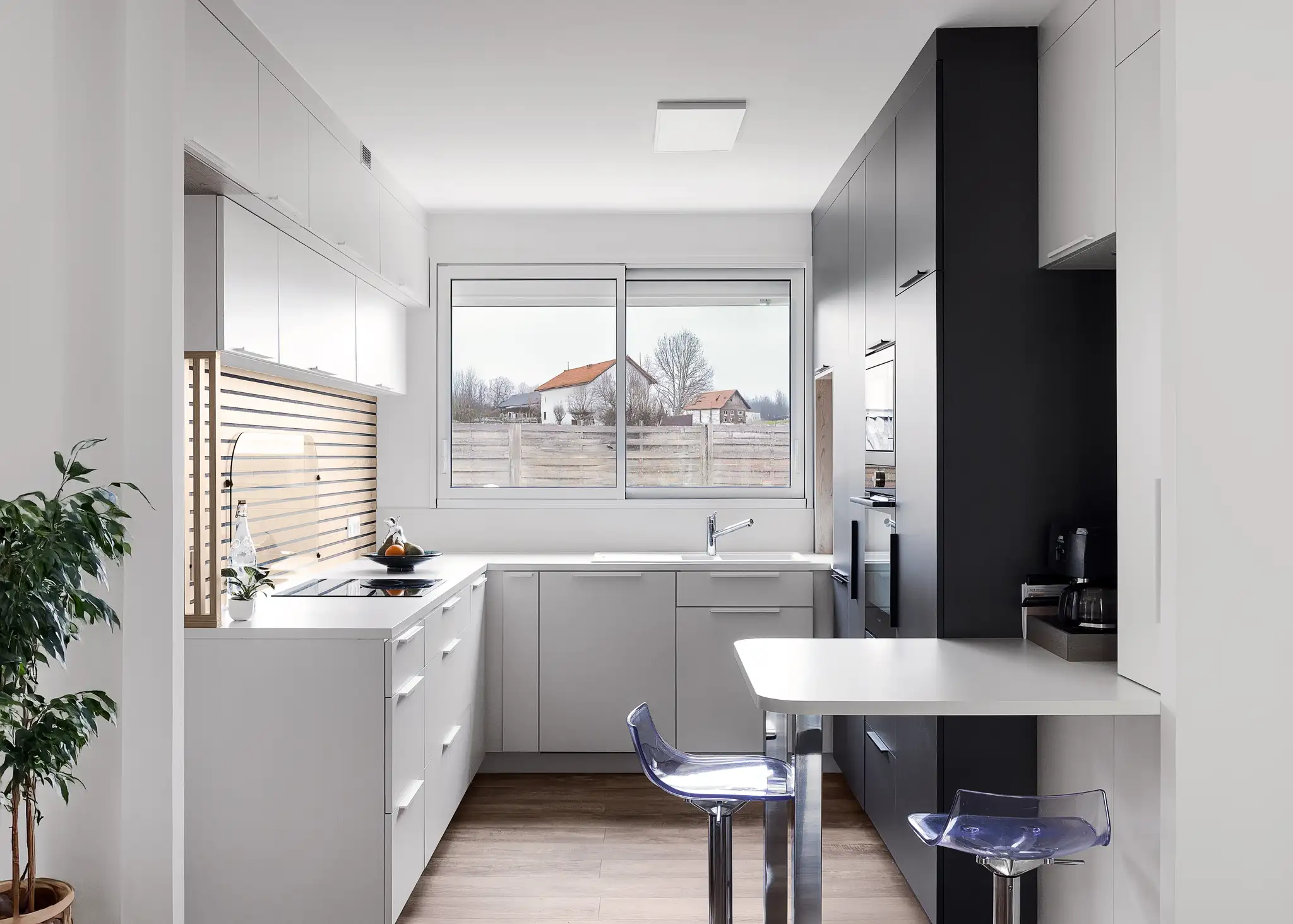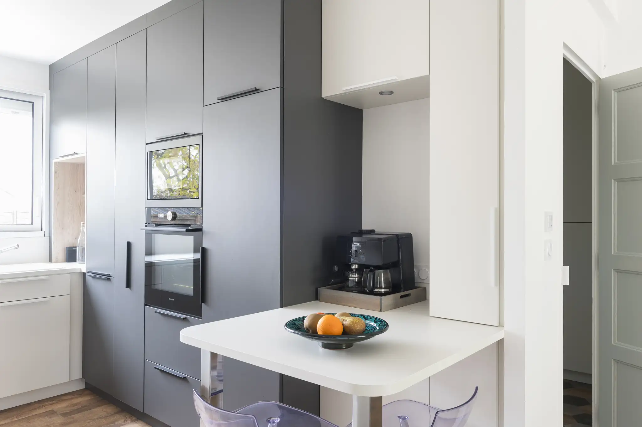 La cuisine, entièrement redessinée avec des façades EGGER Blanc Porcelaine et Gris Ombre, adopte une logique linéaire et épurée. L’intégration d’un grand linéaire bois rainuré conçu sur mesure apporte chaleur, texture et verticalité. La nouvelle implantation, pensée pour optimiser chaque centimètre, remplace l’ancienne configuration en U par un espace fonctionnel, ouvert et parfaitement rangé.