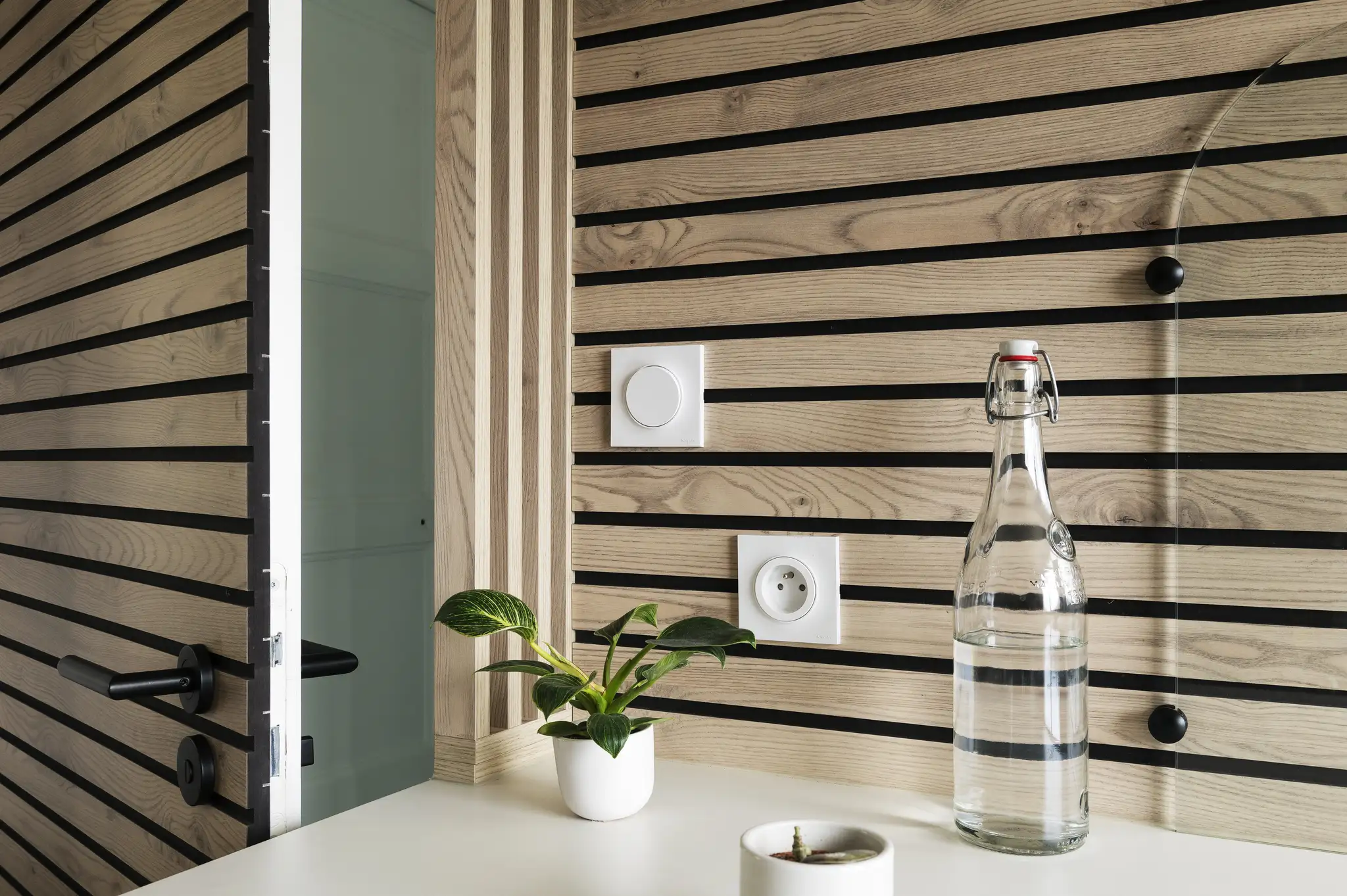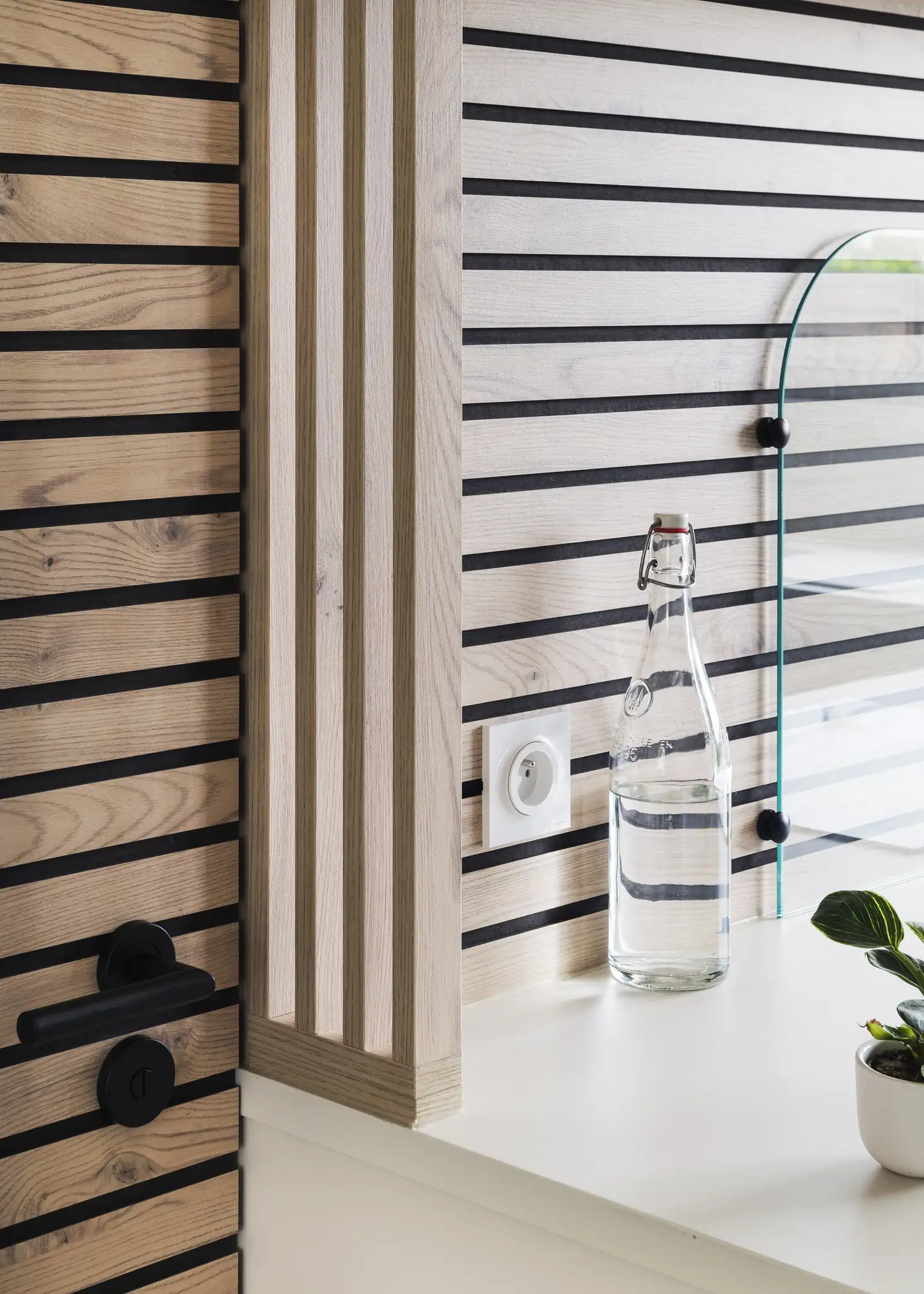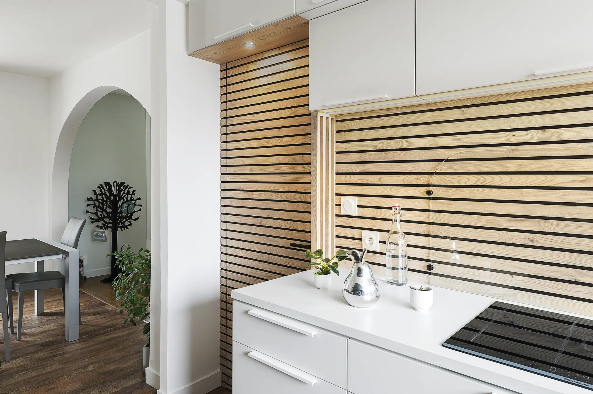Le mobilier sur mesure complète cette cohérence, niche de l’entrée en Châtaignier du Kentucky, claustra et verrière bois qui assurent une transition subtile entre l’entrée et la cuisine.