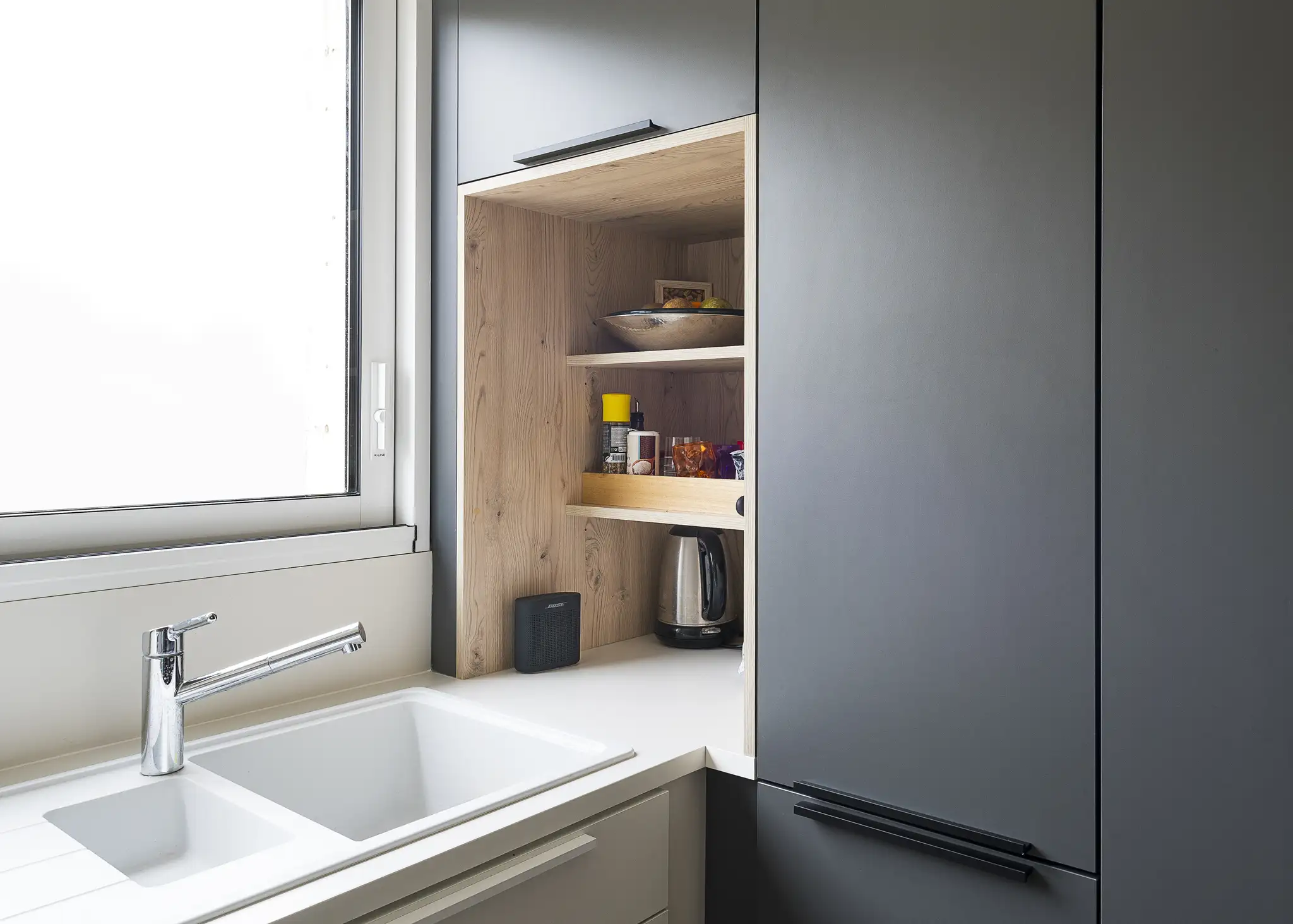 Les façades EGGER Blanc Porcelaine et Gris Ombre, associées à un grand linéaire sur mesure en Châtaignier du Kentucky, créent un équilibre entre modernité et chaleur. L’ancienne implantation en U laisse place à une cuisine fonctionnelle, parfaitement rangée, où chaque centimètre a été optimisé.