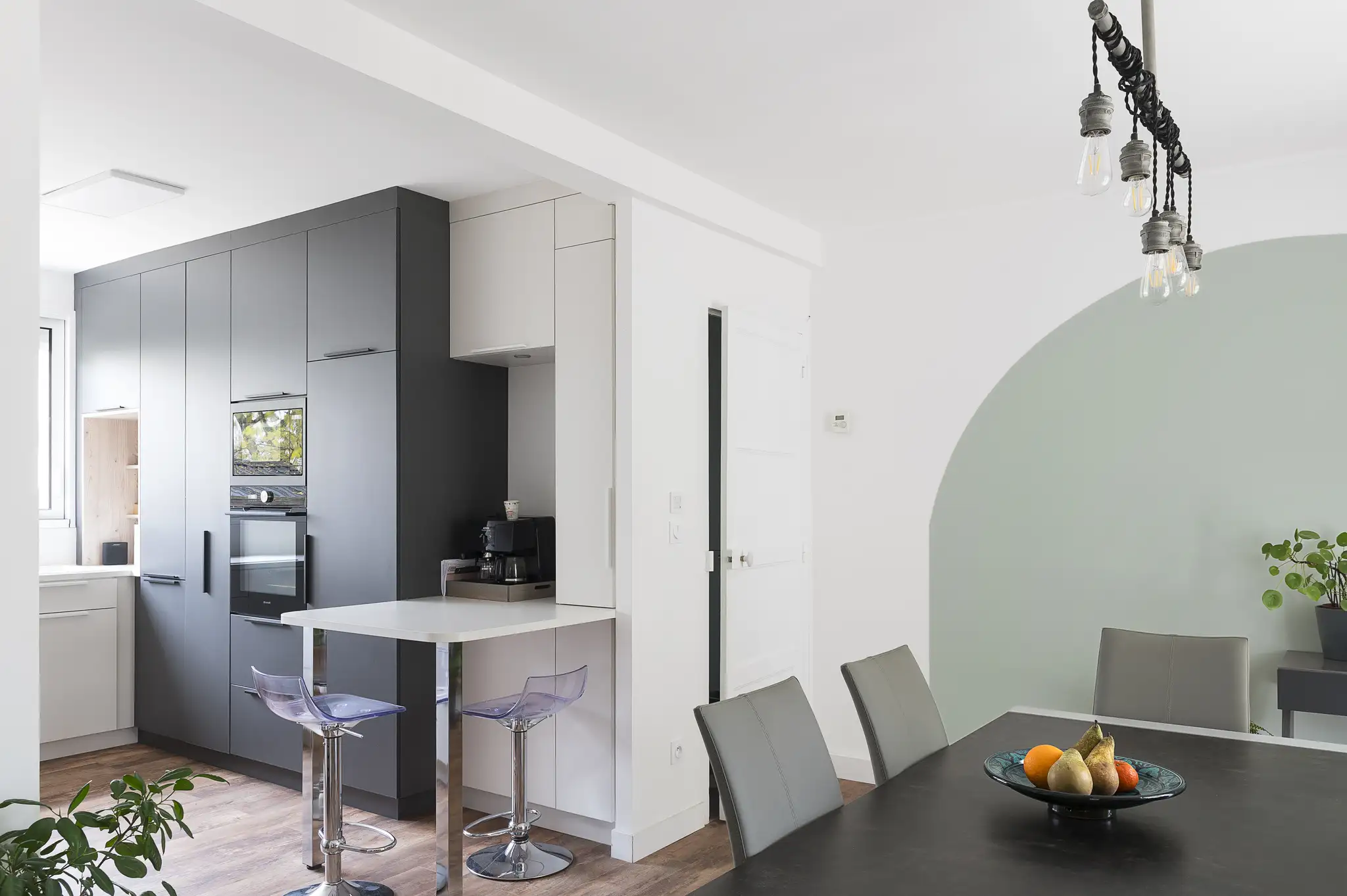La grande arcade centrale devient un repère visuel. Elle organise l’espace, encadre le mobilier, fait dialoguer les volumes. La salle à manger profite d’une lumière traversante. Le mur en demi-cercle peint en Sage Green donne du caractère sans alourdir. Le sol Moduléo 55 aspect bois unifie l’ensemble et crée une continuité douce. Une menuiserie double portes battantes changée en baie à galandage pour faciliter l’accès du séjour vers la véranda coté jardin.