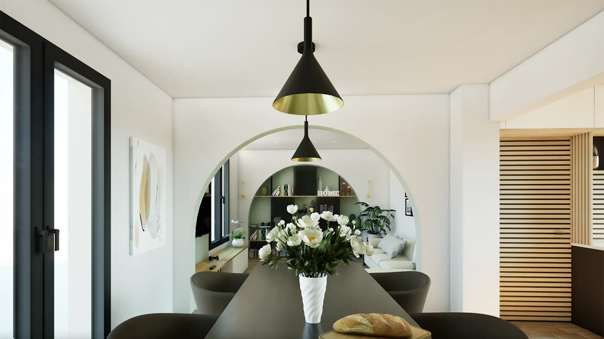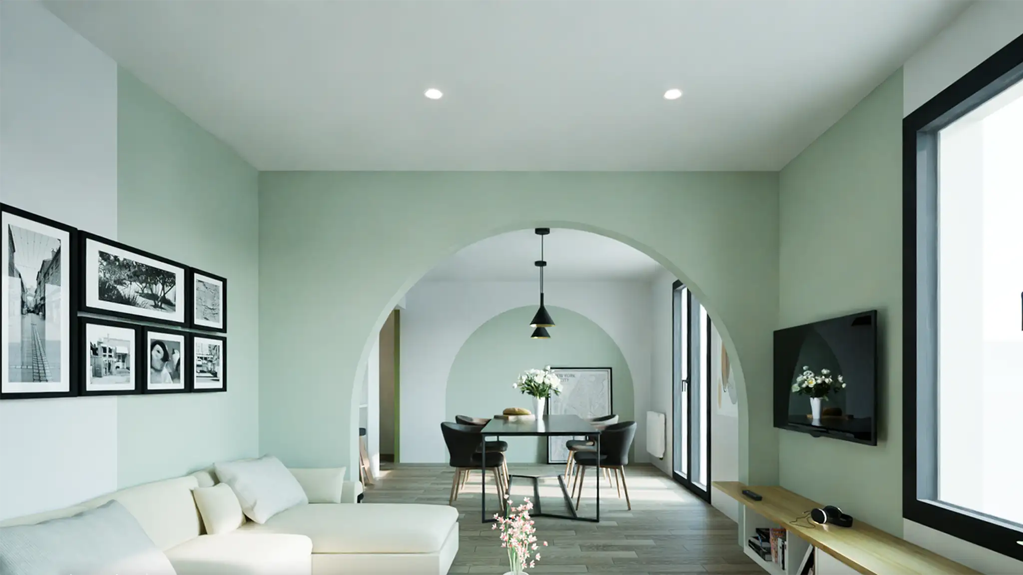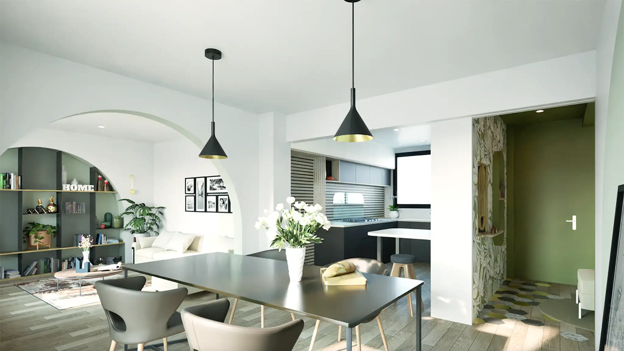 Les arcades existantes, longtemps perçues comme des contraintes, deviennent ici un fil conducteur. Elles structurent le regard, créent une profondeur visuelle et définissent une signature douce et arrondie entre les pièces. Un travail précis sur les teintes renforce cette fluidité : le “Sage Green” appliqué en alcôve mural dialogue avec le blanc lumineux des parois, créant un rythme calme et graphique.