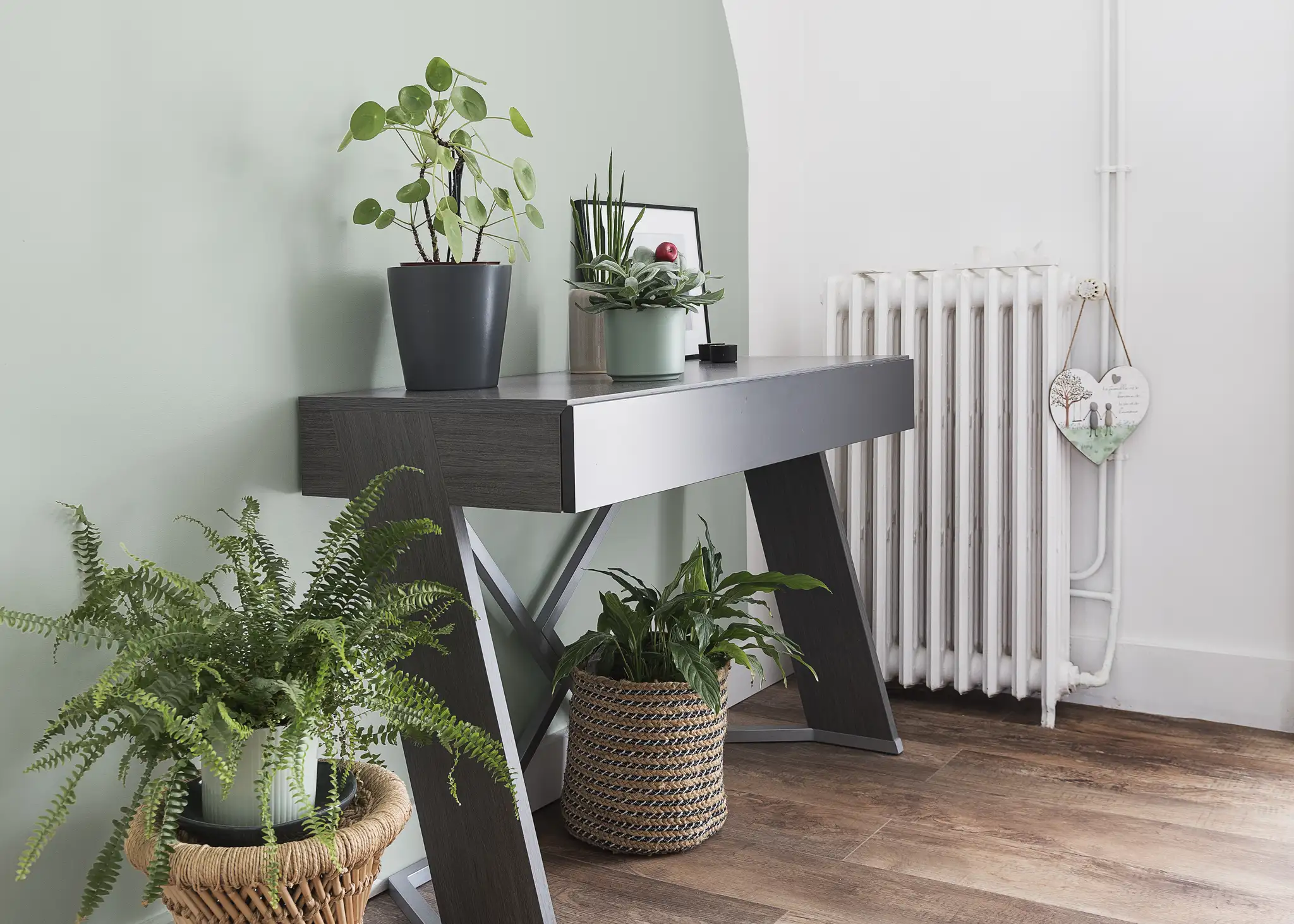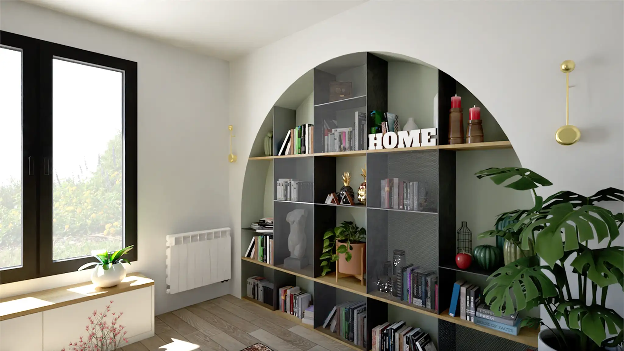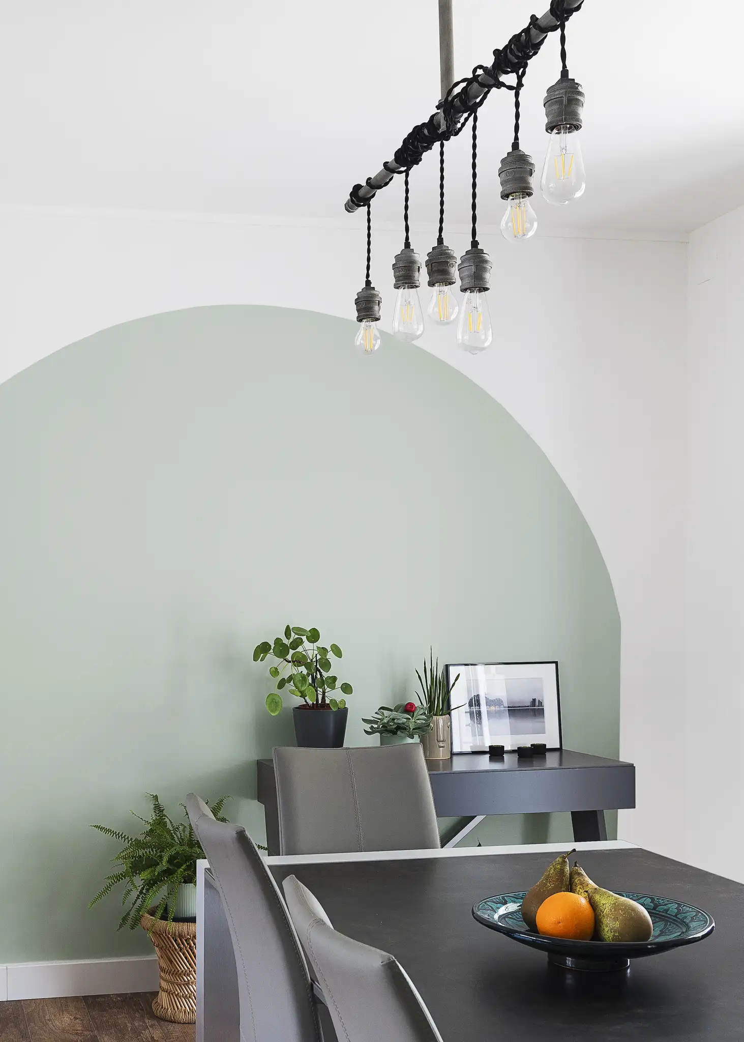Les arcades existantes, longtemps perçues comme des contraintes, deviennent ici un fil conducteur. Elles structurent le regard, créent une profondeur visuelle et définissent une signature douce et arrondie entre les pièces. Un travail précis sur les teintes renforce cette fluidité : le “Sage Green” appliqué en alcôve mural dialogue avec le blanc lumineux des parois, créant un rythme calme et graphique.